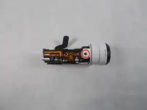 Теперь удалите винт непосредственно над ЖК-дисплеем, тонкий прямоугольник близ задней части блока объектива. Это ослабит чёрный пластиковый кожух над внутренней электроникой.
