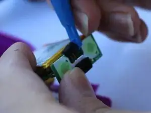 Используйте пластиковый инструмент для открытия, чтобы поднять ЖК-экран вместе с фиолетовым корпусом и отложите его в сторону, обнажив материнскую плату и шлейф разъёма.