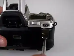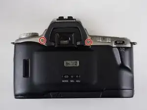 Вытащите два серебристых винта Phillips #00 длиной 5,0 мм с каждой стороны видоискателя.