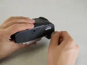 Начиная под кнопкой «SPOT», используйте круглую сторону металлической лопатки и энергично подденьте серую верхнюю панель камеры. Продвигайтесь против часовой стрелки, поддёвывая в разных местах, пока верхняя панель не начнёт отходить. Подденьте по всему периметру до тех пор, пока не доберётесь до логотипа «STsi».