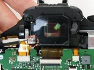 Используйте отвертку Phillips J000 для удаления винта, расположенного в нижнем левом углу передней панели стекла видоискателя.