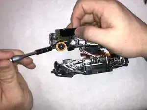 Переверните камеру в нормальное положение и снимите два винта 6,4 мм с верхней части пластиковой рамы.