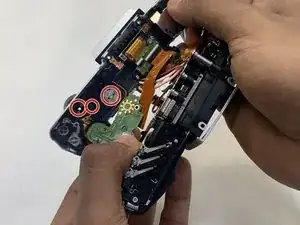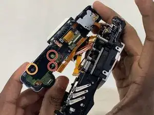 Переверните камеру так, чтобы она лежала на задней части. Откройте экран до полного выдвижения и перпендикулярного положения, как показано ниже. Снимите три винта в этой области крестовой отвёрткой Phillips #00.