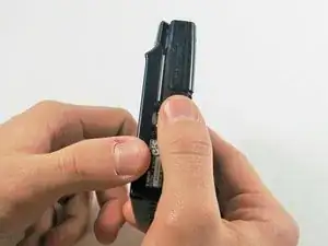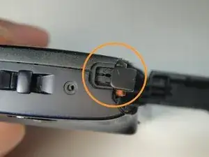Удалите батарейку, нажав на оранжевый элемент наружу; батарейка выскочит.