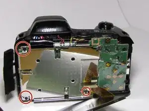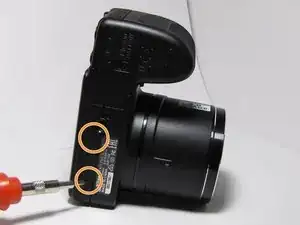 Удалите два винта Philips #000 длиной 5 мм с левой стороны камеры, расположенные рядом с кнопкой питания.