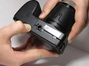 Удалите два винта Philips #000 длиной 5 мм с левой стороны камеры, расположенные на стороне, где вставляются аккумуляторы.