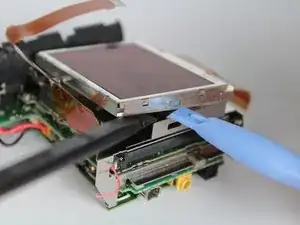 Вставьте пластиковый инструмент между краем экрана и металлическим кронштейном с противоположной стороны от отсека для батареи.
