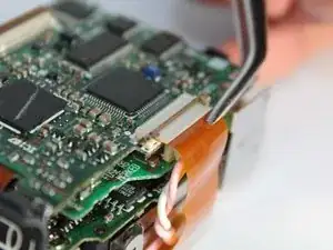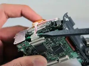 Используйте пинцет, чтобы захватить динамик (расположен слева на камере) и тяните строго вверх.