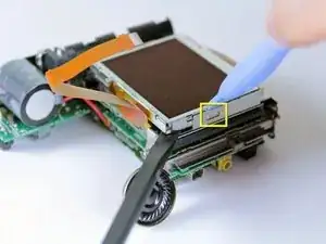 Используя пинцет, аккуратно потяните за маленькую оранжевую ленточку в верхнем левом углу рядом со вспышкой, чтобы снять квадратную вставку.