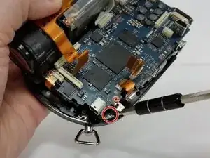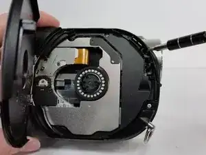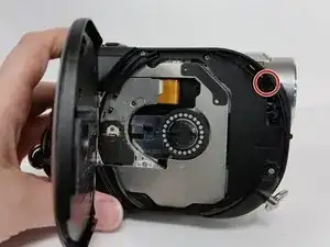 После открытия дверцы диска найдите винт (крестовая отвертка #00) внутри, в верхнем правом углу, ближе всего к объективу видеокамеры.