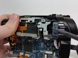 Сняв винт, поднимите серебристую панель над блоком объектива и сдвиньте её в сторону объектива.