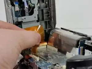 Как только устройство откроется, аккуратно отсоедините ленточный кабель от материнской платы и отложите серебристую часть устройства.
