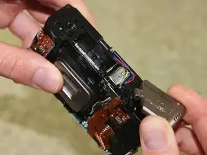 Сильно оттяните заднюю половину корпуса от корпуса камеры.