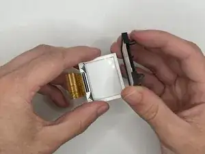 Проследите золотистую шлейфовую ленту от экрана до разъёма экрана. Оттяните две маленькие чёрные защёлки по обеим сторонам разъёма от разъёма, пока он не выйдет.