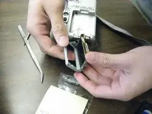 Удалите один винт Phillips #0 у основания вращающегося рычага. Это позволит снять крышку экрана.