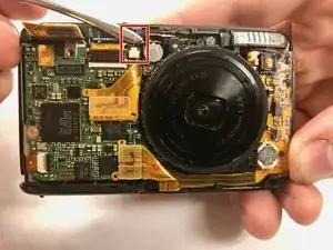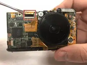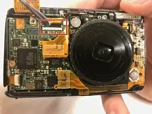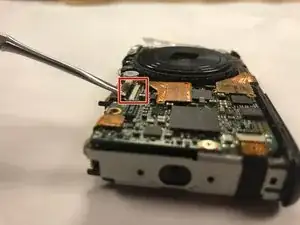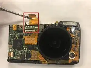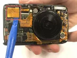 Отключите маленькую микросхему от передней панели камеры, аккуратно поддев металлической лопаткой пучок красных проводов, видимый снизу. Затем поднимите пучок проводов вверх, параллельно передней панели камеры.