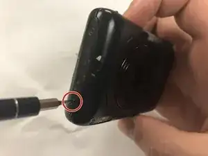 Снимите серебристый винт Phillips 3,0 мм с задней части корпуса камеры, расположенный в правом верхнем углу.