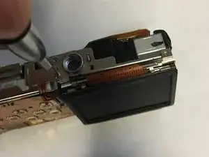 Удалите два серебристых винта 3 мм с правой стороны камеры.