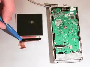 С помощью пластикового инструмента для вскрытия извлеките экран из разъема, аккуратно поднимая каждый угол. Поднимите экран к плате, к которой он все еще подключен.