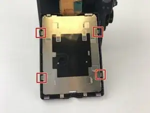 Найдите четыре зажима на металлической части, закрывающей заднюю сторону экрана, как показано на фото. Нажмите каждый из этих зажимов к центру металлической детали и поднимите металлическую пластину.