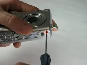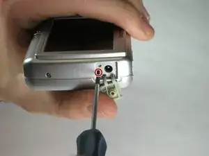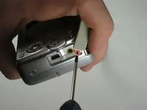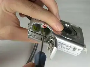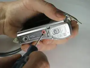 Освободите мини-USB порт с боку камеры и открутите винт рядом с шарниром заглушки.