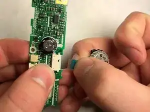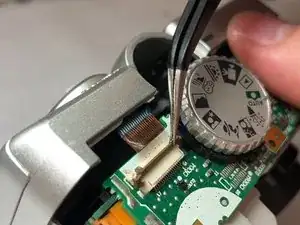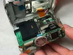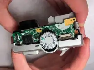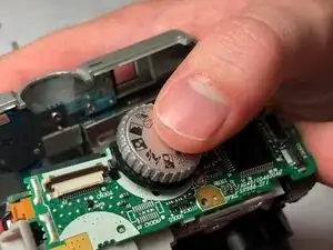 Нажмите или сдвиньте верхнее колесо в сторону задней части камеры, чтобы отщёлкнуть от материнской платы.