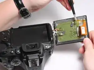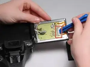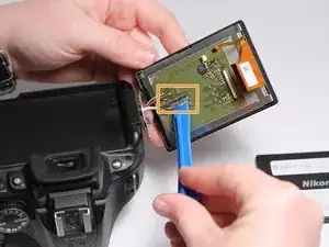 Используйте пластиковый инструмент для открытия, чтобы приподнять шлейф с левой стороны печатной платы и отсоединить его от разъема.