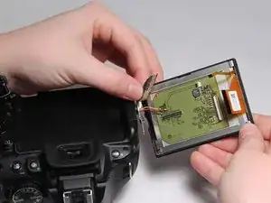 Используйте пластиковый инструмент для открытия, чтобы поднять зажим, удерживающий шлейф с правой стороны печатной платы, и снимите его.