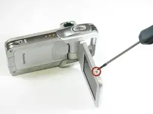 Откройте и поверните экран, затем удалите винт (3,5 мм Philips), указанный с помощью отвертки.