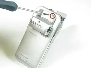 Удалите винт (2,6 мм Philips), указанный на верхней части экрана, с помощью отвертки. Затем удалите соответствующий винт на нижней части экрана.