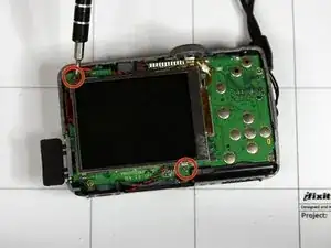 Удалите два винта, удерживающие экран на плате, отмеченные красными кругами.