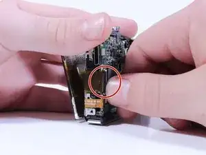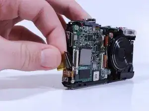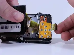 Вытяните ribbon, соединенный с экраном, из-за схемы кнопок на задней панели камеры.