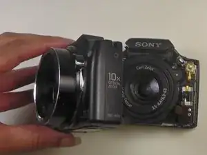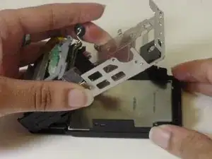 Переверните металлическую рамку влево от корпуса камеры и положите её на рабочую поверхность.