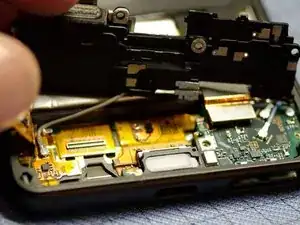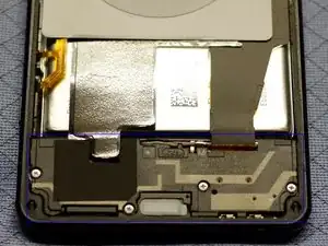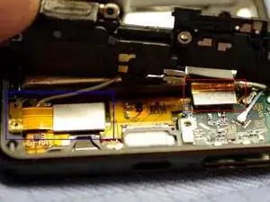 Теперь отключите разъём дисплея (разъём выделен синим, он внизу слева). Можно поднять и аккуратно отсоединить разъём дисплея (шлейф, входящий с левой стороны) маленькой лопаткой. Эти разъёмы очень хрупкие, будьте осторожны, чтобы не повредить контактную площадку на плате телефона.