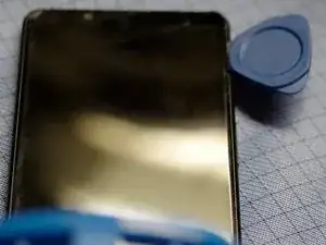Если начала, аккуратно подденьте края медиатором или лопаткой. Возможно, потребуется дополнительно прогреть участки, где клей ещё держит. Не требуется засовывать лопатку или медиатор глубоко в корпус — клей всего около 2 миллиметров в ширину, а внутри находятся разъёмы и кабели, которые нельзя повредить.