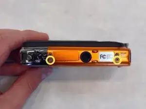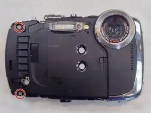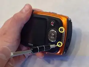 С помощью крестовой отвёртки №00 удалите два винта длиной 3,0 мм на задней панели камеры. Это позволит снять крепление для ремешка и заднюю крышку.