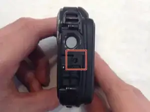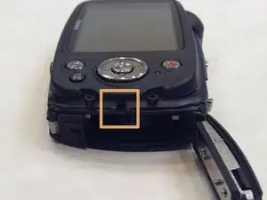 Четвёртая защёлка скрыта за крышкой отсека батареи. Чтобы получить доступ к защёлке, см. инструкцию по замене батареи Fujifilm XP20.