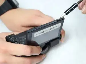 Используйте нейлоновую лопатку, чтобы аккуратно снять повреждённый экран ЖК с корпуса камеры.
