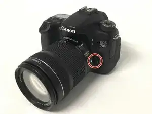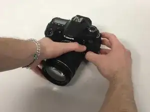 Сначала отсоедините объектив, нажав и удерживая кнопку освобождения, выделенную на изображении.