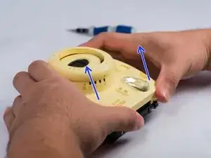 Когда все винты удалены, аккуратно подденьте переднюю панель руками или пластиковыми инструментами для вскрытия. Учтите, что между передней панелью и основной платой присоединена пружина, поэтому избегайте излишнего натяжения пружины.