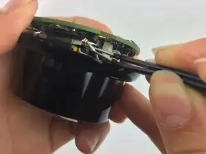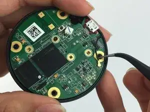 Используйте пластиковую лопатку, чтобы приподнять материнскую плату и камеру достаточно, чтобы получить доступ и отключить белый кабель с помощью пинцета.