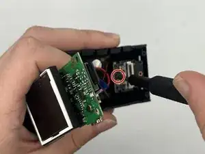 Отодвиньте материнскую плату в сторону и снимите ленту с маленького чёрного пластикового элемента.