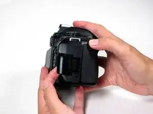 Откройте дверцу отсек для карты памяти, расположенную справа от цифрового дисплея, нажав на неё большим пальцем в направлении стрелки.