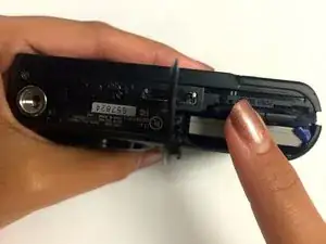 Отсек батареи находится в нижней части камеры. Если перевернуть камеру объективом к себе, можно увидеть стрелку с надписью "OPEN" под ней.