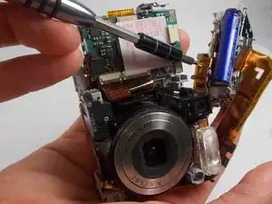 Снятие клеммы батареи Sony Cyber-Shot DSC-S90 считается процедурой средней сложности. Это связано с тем, что для снятия клеммы батареи требуется разборка практически всей камеры. Несмотря на повышенную сложность этого 15-шагового руководства, единственным необходимым инструментом является отвертка J00.