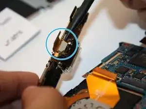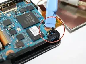 Оттяните назад чёрный зажим, расположенный в правом нижнем углу камеры, вправо с помощью пластикового инструмента для вскрытия. Он удерживает основную плату.