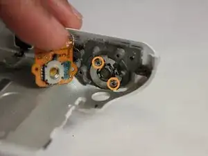 Снимите все винты, выделенные кругом. Один винт 1/8" рядом с вспышкой, один винт 9/32", удерживающий кнопку вспышки, два винта 5/32" на серой рамке для вспышки и два винта 5/32", удерживающие кабельные рамки в верхнем левом углу.