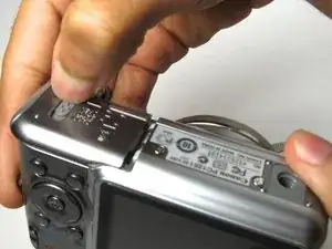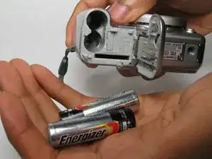 На нижней части камеры откройте отсек батарей, сдвинув фиксатор вверх. Дверца отскочит, позволяя вытащить батареи.