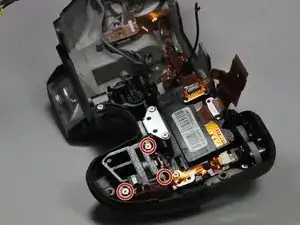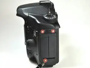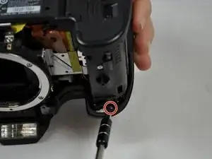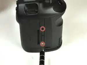 Удалите два винта 5 мм, расположенные под колёсиком и под кнопкой спуска затвора, используя отвёртку JIS #000.