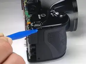 Снимайте заднюю крышку аккуратно, чтобы не повредить ленточный разъём ЖК-экрана или внутренние компоненты камеры.